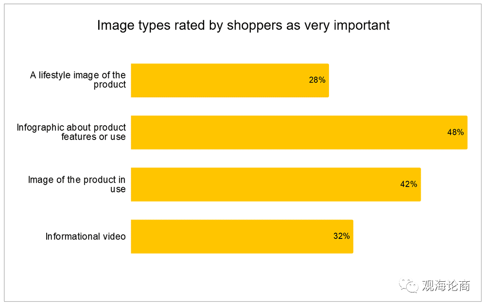 结果是,各种类型的好的产品图片都受到消费者的重视,但帮助说明产品功能的实用图片被评为比生活方式照片或信息视频更重要。信息图,将产品图片与文字或图形相结合来解释不同的功能,被评为最高的产品图片。