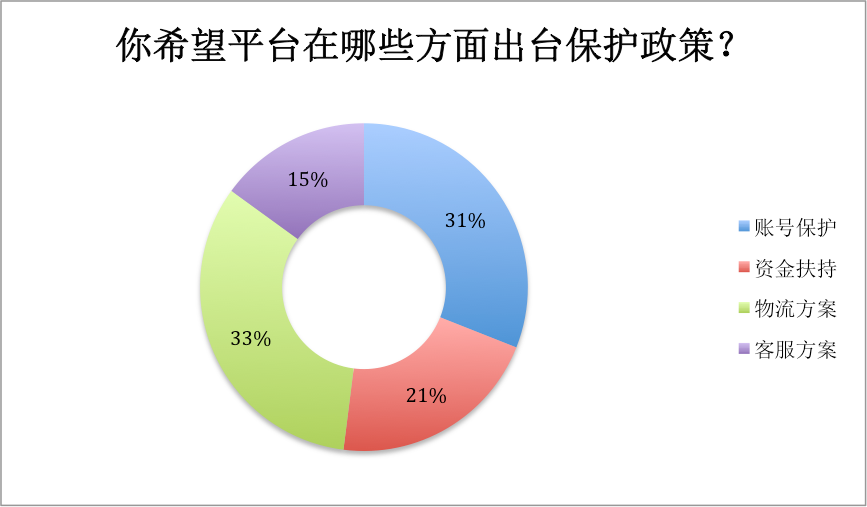 在雨果网的调研中,33%卖家希望平台提供相应的物流方案,31%卖家希望平台提供账号保护方案,21%卖家希望平台提供资金扶持。