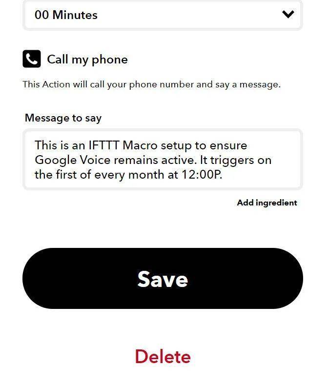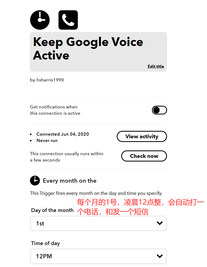 This is an IFTTT Macro setup to ensure Google Voice remains active. It triggers on the first of every month at 12:00P.