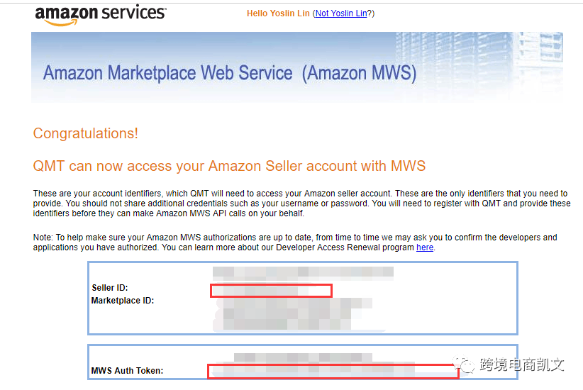 同意亚马逊的协议之后,后台会生成一串乱码的密匙MWS Auth Token,把Seller ID和MWS Auth Token填写在QMT上面即可,这样就可以即时查看亚马逊销量了。