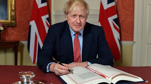 △资料图:英国首相鲍里斯·约翰逊今年1月正式签署英国脱欧协议。图片来自英国天空新闻网