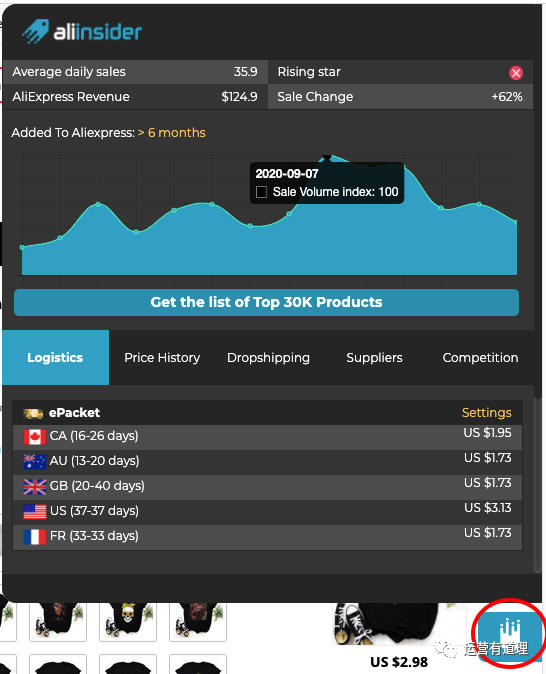 2、进入具体某个商品页面后,点击右下角的Ali insider的图标,登录速卖通账号后,可以看到如下图信息。包括产品平均日销量、销售额、销量趋势图、产品发布时间等。