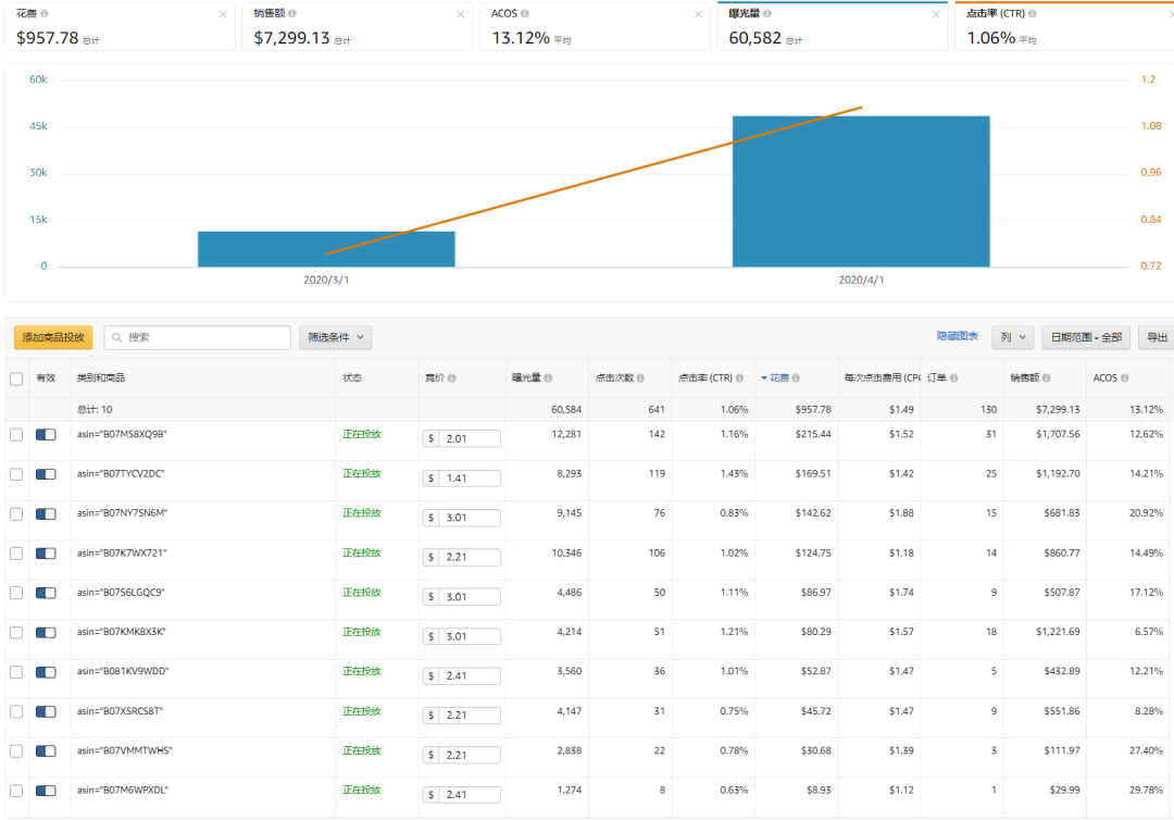 在实际投放,践行两个策略过程中,建议大家都按照10个ASIN为一个广告活动,这样保证预算能够尽可能的实现均匀分配,不然大量ASIN在一个广告活动很有可能会导致两极分化严重,好的ASIN非常好,差的连展现都没有。另外,针对那些一直跑不出展现或者转化率,有效点击率很差的广告活动,可以直接关闭即可,这说明这些ASIN的流量你可能蹭不到。