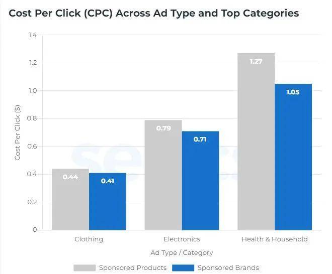 在所有亚马逊类别中,赞助商品牌广告的每次点击费用往往低于SP广告。在上面我们提到的3个类目中也可以观察到这种趋势。