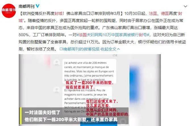 据南都周刊报道,随着疫情的反扑,欧洲多国正再度掀起一轮新的囤购潮,来自中国的家具正在成为国外抢购的重点。广东佛山家具灯具出口暴增,涨幅最大高达500%,工厂订单排到明年。一对法国夫妇因网购10万中国家具还被银行封号。