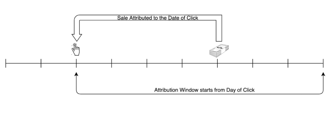 我们先从第一项“广告销量误差”开始聊起。亚马逊的广告有一个概念,我们称之为“转化窗口期”,这个窗口期并没有一个统一的固定时长,而是一个时间段的概念。如下图所示,主要描述的是广告产品被消费者通过广告点击以后,到最终产生购买的一个时间周期。