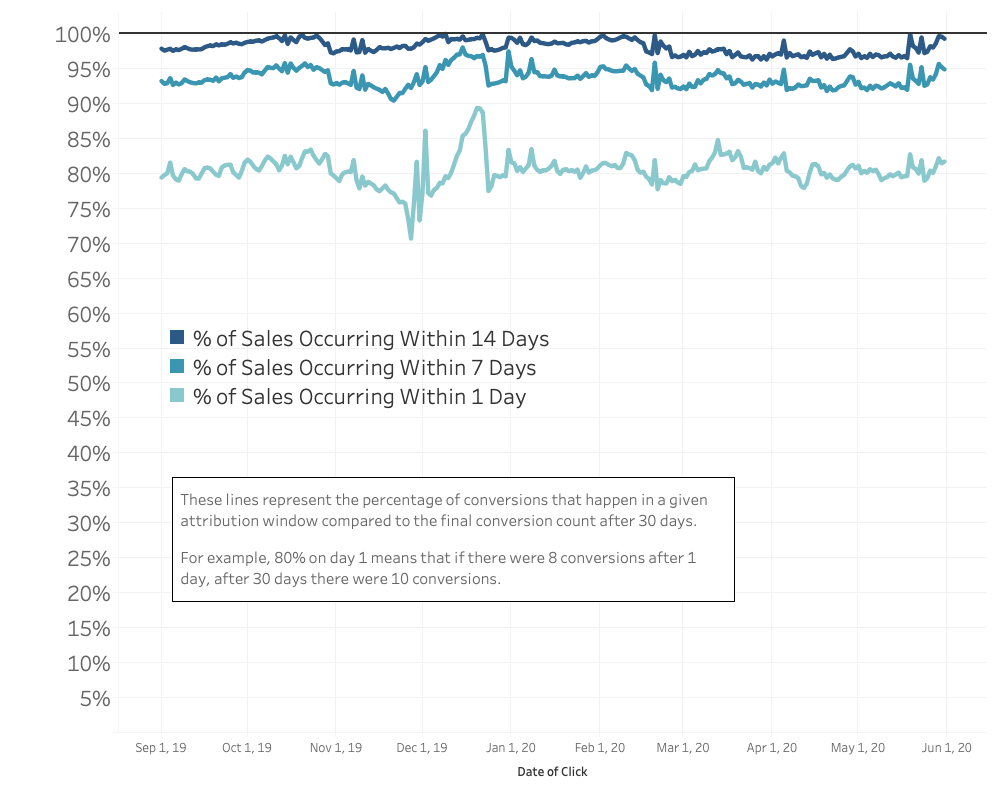如上图所示,在所有转化了的广告订单里面,其中80%的购买都发生在产生点击的当天,这个数据也不难理解,大部分人在没有特殊的情况下,都会直接购买想要的产品。但是各位老铁要注意的是,其中20%的购买都不是在当天完成的,如果你总量足够大的情况下,百分之二十也不是一个小数目了。而且在点击之后的七天,也只有95%的购买完成了,还有5%的购买会发生在一周之后。