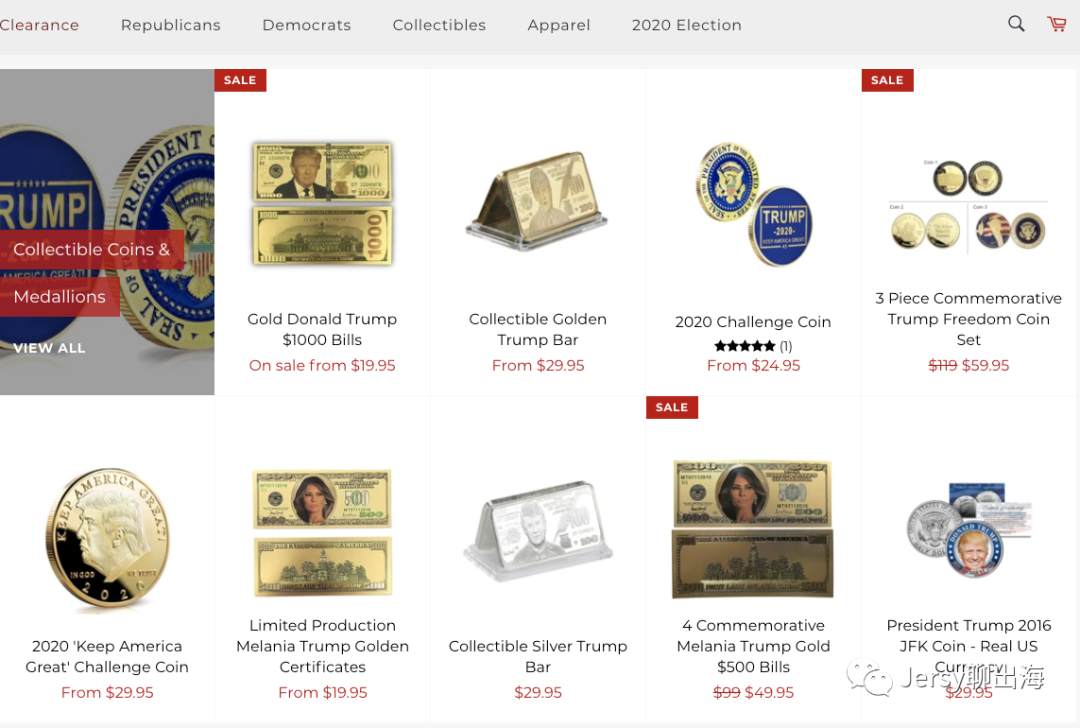 该店铺主要售卖的产品为总统周边,热卖产品主要为川普纪念币,伊万卡纪念币,川普2020竞选袜子。网站受众主要为川普或共和党的狂热粉丝,他们热衷于收集总统纪念品。