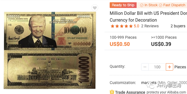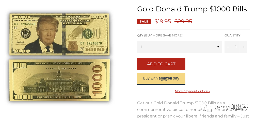 这其中产品的成本十分低廉,大约只有售价的10%。以下文的川普纪念纸币为例,成本只有0.5美金,且非常轻,只有10克左右。这让货物成本非常低。、