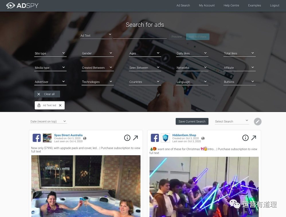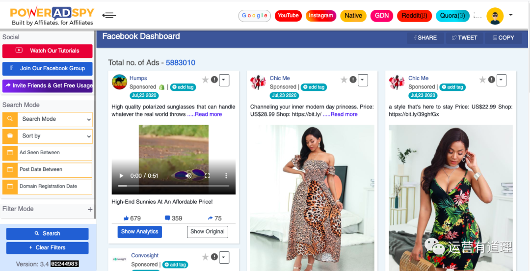 最后推荐的是poweradspy,免费版本:无卡免费试用10天,100次搜索。支持谷歌、FB、油管等平台的广告跟踪和分析。