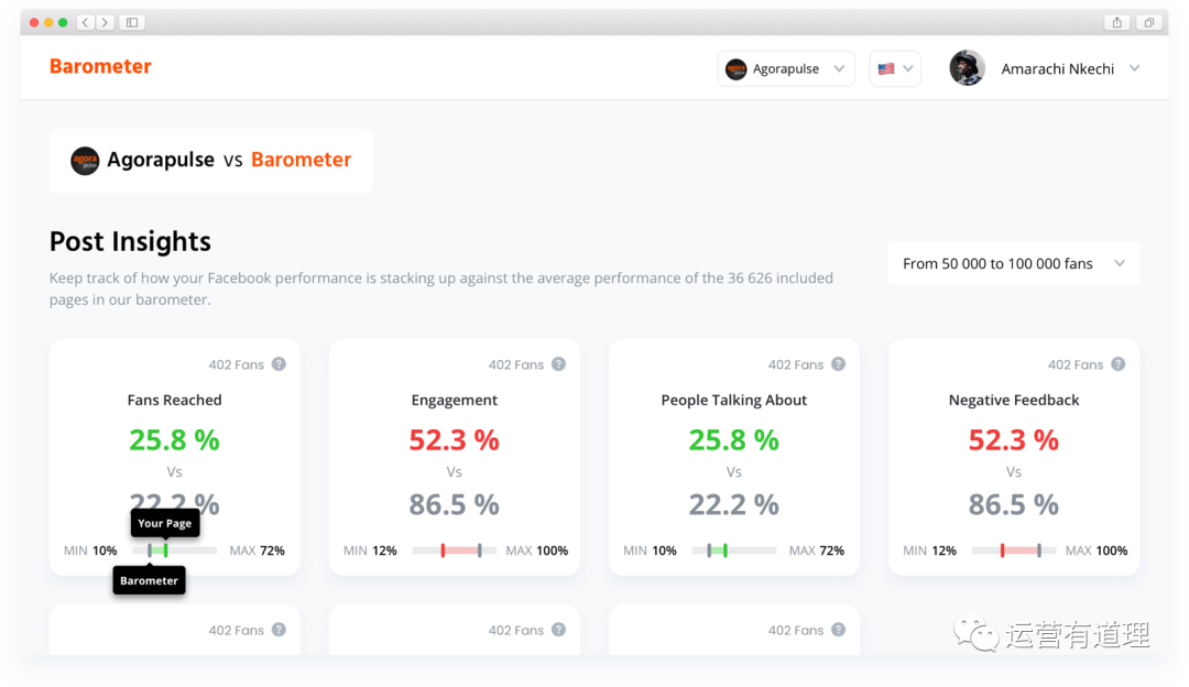 想知道你的Facebook页面的健康吗?Agora Pulse的该工具可提供覆盖率,参与度,反馈,病毒式传播等方面的统计信息,并将你的搜索结果与粉丝数量相近的网页结果进行比较。基准细分(无论页面大小如何都可以查看)如下: