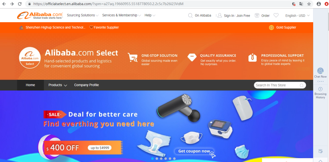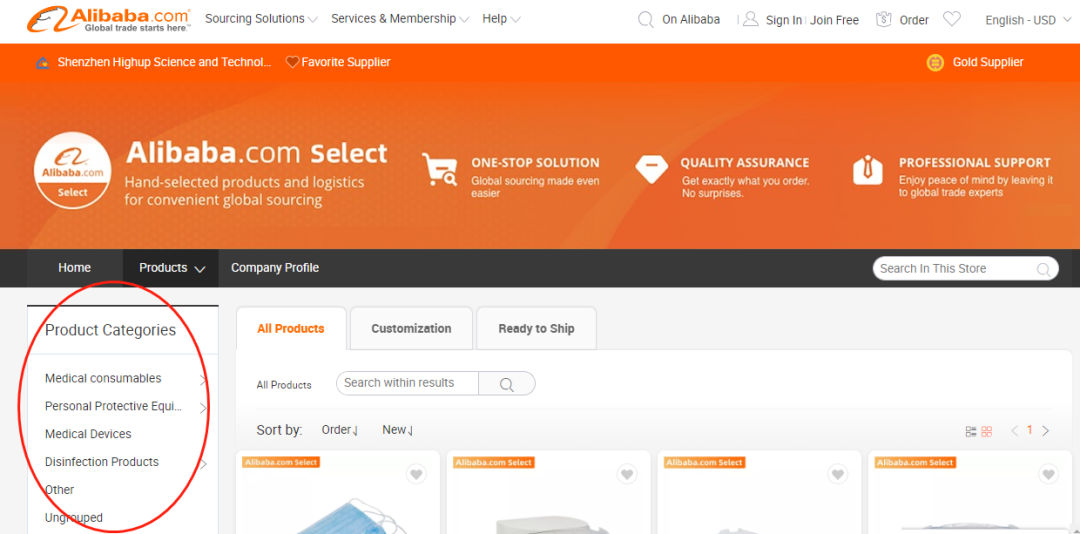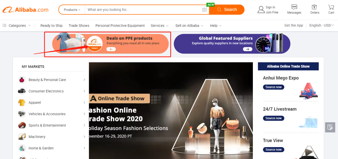 亿邦动力登陆阿里巴巴国际站发现,在首页焦点图上方,点击一个打着“Alibaba.com Select”图表、名为“Deals on PPE products”的信息栏即可进入这个自营店铺。