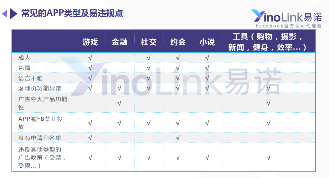 https://www.facebook.com/policies/ads,此外我们在投放受限制广告时,我们也要注意,如涉及真钱赌博的游戏App,一定要申请白名单,社交类App如果带有约会属性的话也要走白名单,详细的注意事项可以参考下图:
