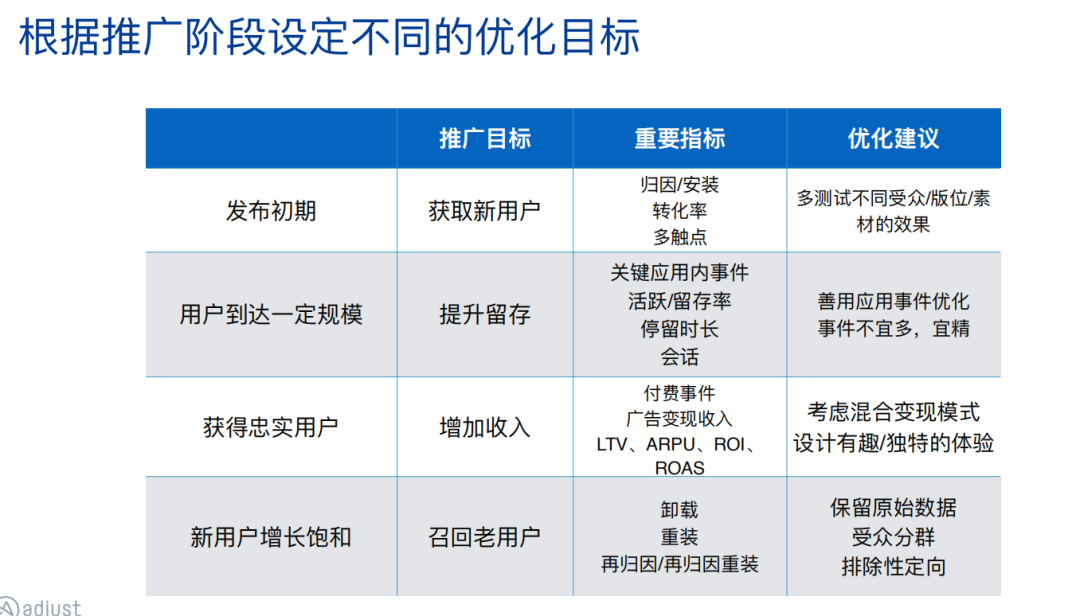 提高用户留存和活跃度,根据推广阶段设定不同的优化目标。