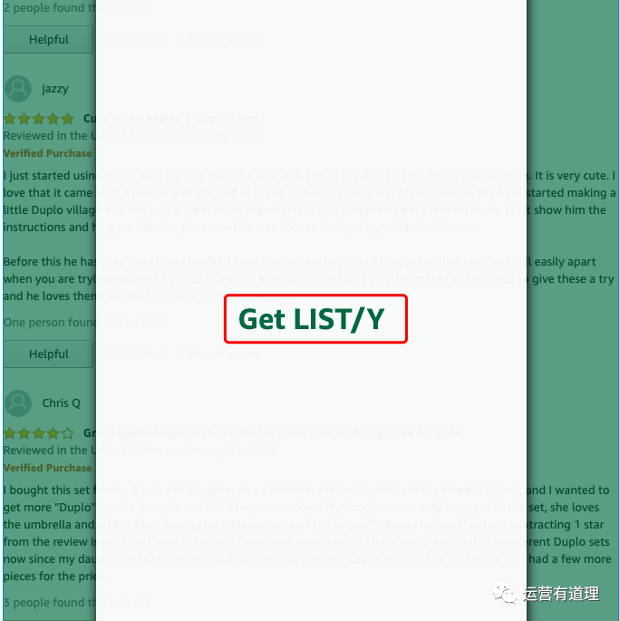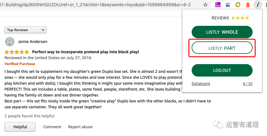 2)安装好插件后(不会安装插件记得找我),浏览器进入你想抓取数据的网址。如下图,我们进入到了一个亚马逊产品的评价页,点击“Listly part” (部分抓取的意思)