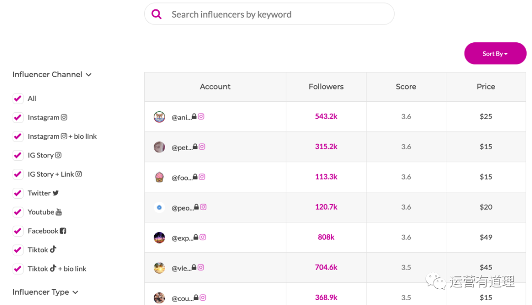 支持根据行业、年龄、性别、国家、语言等来搜索网红;支持根据粉丝量、评分、合作价格进行排序,大大提升命中率