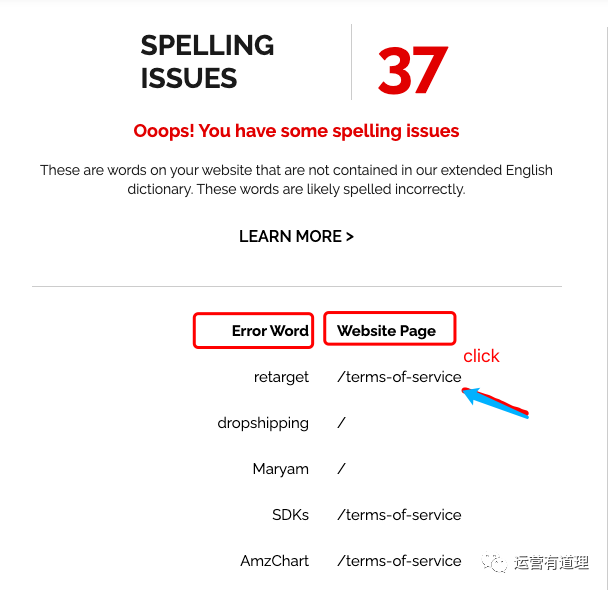 即可查询出,什么页面有拼写错误的单词(可以忽略其它功能直接看这个),可以点击 Website page,进入对应的页面。