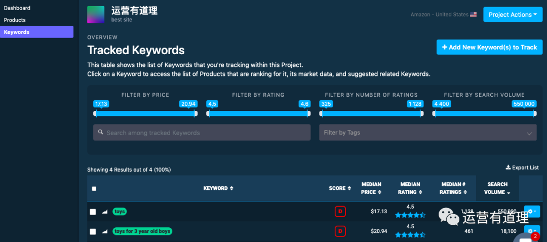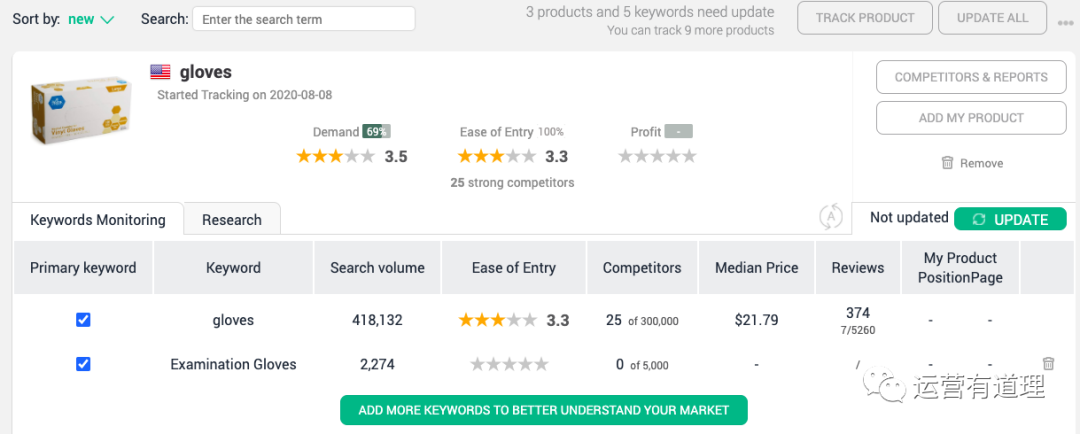 选定要跟踪的产品后,可以为该产品设定跟踪关键词,该工具可以分析出关键词的搜索量、竞争对手数量及实力、关键词价格等