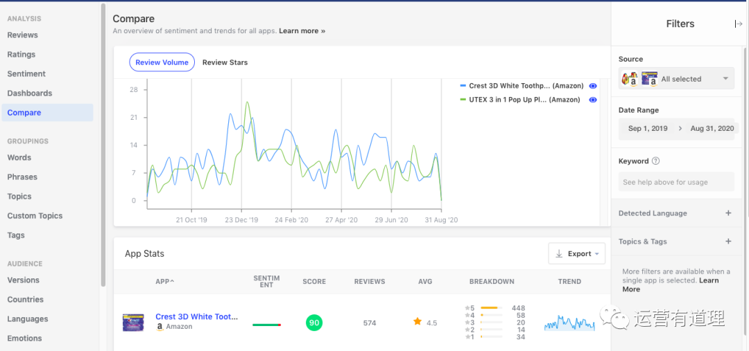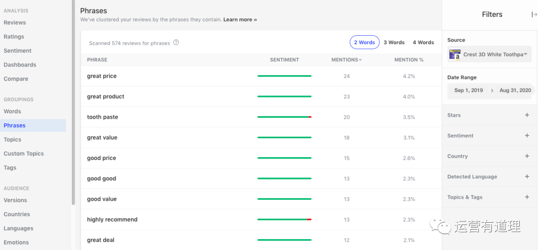 4)其他很多工具都提供的评价关键词、短句分析;根据国家、语言、时间、评价星级对评价进行过滤分析,该工具都支持
