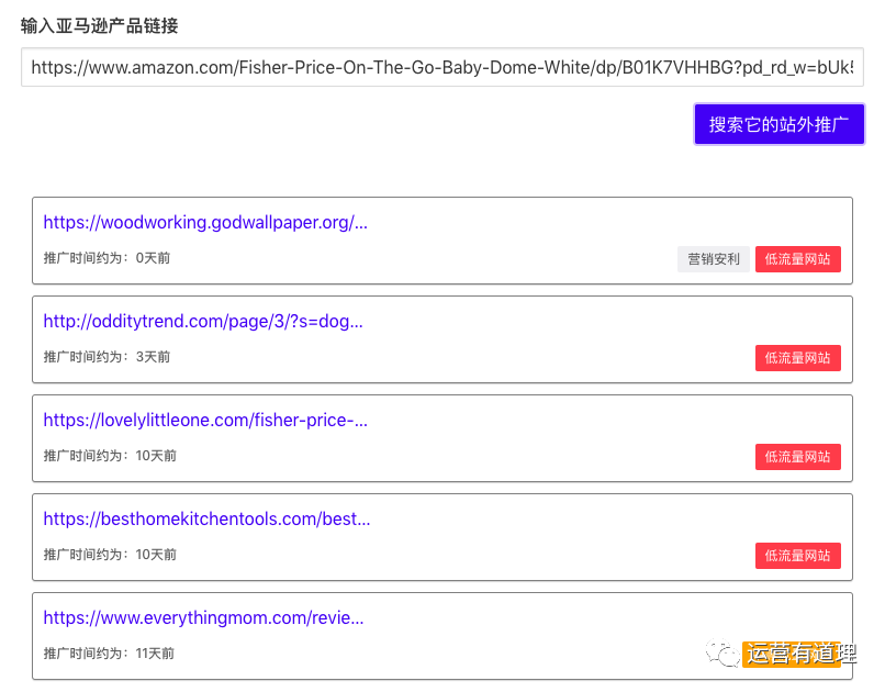这个工具很有价值,当你想了解竞品的某些产品都有什么站外推广渠道时。把产品链接复制到该工具即可查询出来。