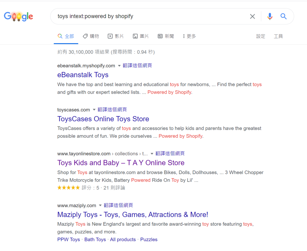 根据靠Shopify搭建网站的这一特点,这里我们可以采用Google高级搜索语法里面的intext语法和related语法,来快速锁定某一个大类目下面所有的Shopify店铺。首先我们可以在Google搜索框里面键入:“toys intext: powered by Shopify” 或者“toys intext: Shopify”