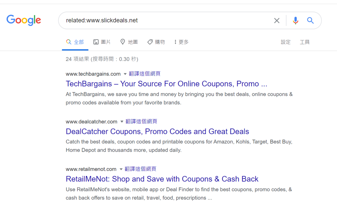 如下图所示,如果你想要找到与slickdeals类似的deals网站,你就可以直接按照“related:网站网址”这种搜索模式,让谷歌帮你找到和这个网站类似的网站,起到了举一反三的作用。所以我们如果发现不错的shopify网站,可以直接用related语法来做举一反三的工作,帮我们找到更多更好的shopify店铺。所以说,通过intext和related这两大搜索语法,基本上能够把任意大类目下的shopify店铺都找出来了!