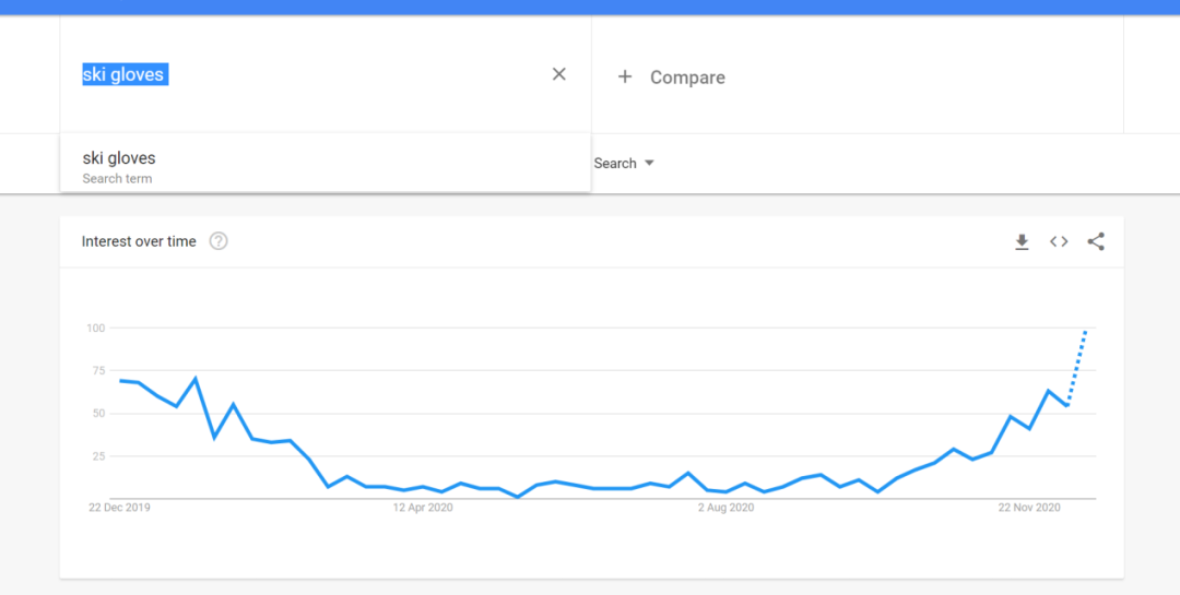 那么具体应该如何使用呢?举个例子大家就明白了:比如我们想要了解滑雪手套的市场,如下图所示,我们可以把核心关键词ski glove放到搜索框进行搜索,随后我们可以得到滑雪手套整体的一个需求走势图,可以看到滑雪手套在一年里面的需求走势情况。