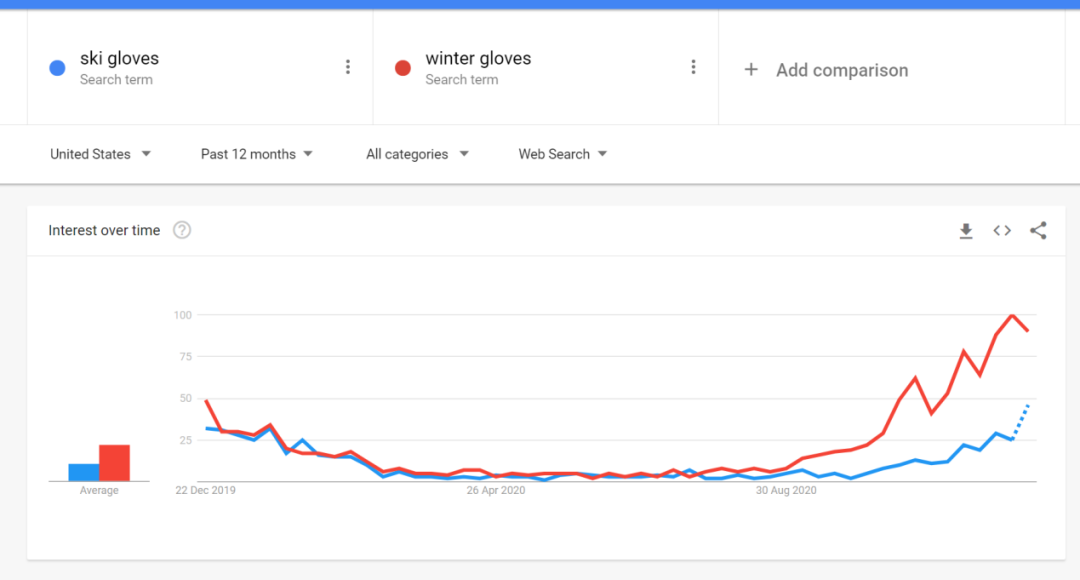 另外,如下图所示,我们还可以把类似产品或者其他意向产品和滑雪手套进行比较,比如可以把winter gloves和ski gloves这两种类似产品作一个比较,这样就可以知道谁的热度和需求更大,方便我们在选择产品遇到困难的时候来做出最终的决定。