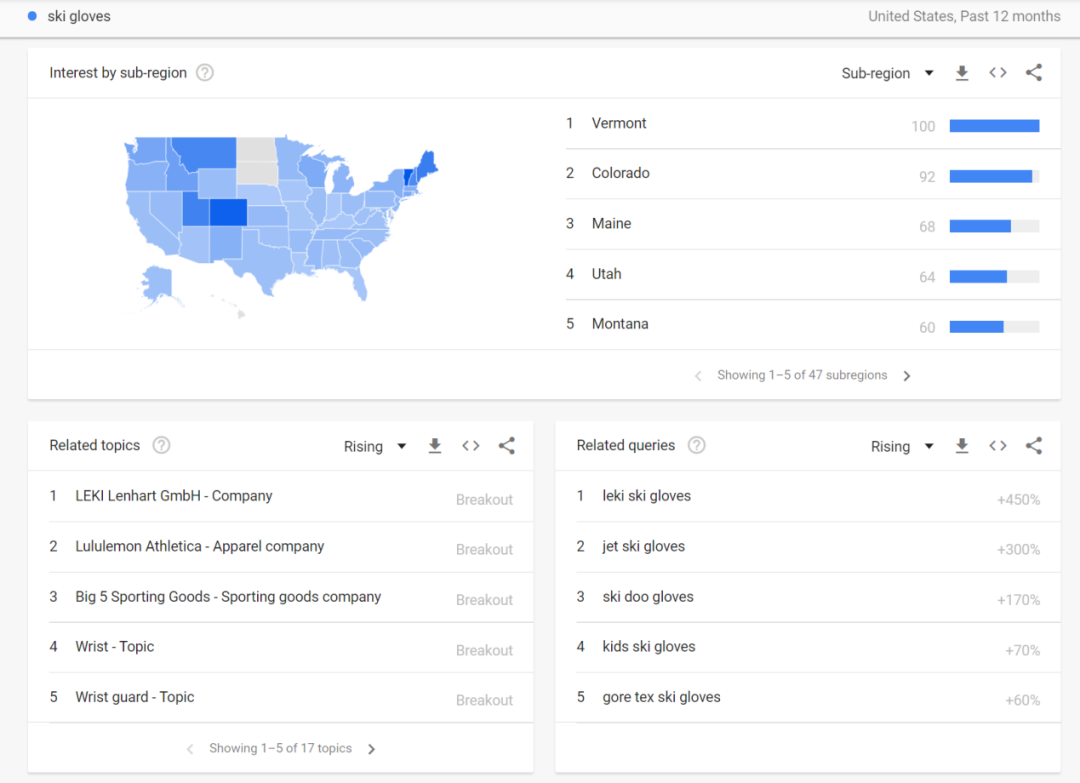 此外,通过Google trend工具,我们还可以得到滑雪手套这个产品在美国不同州的一个需求情况,以及与滑雪手套相关的搜索词和相关话题,方便我们去做进一步的深挖,找到这个产品下面更多的长尾产品和关联产品,以及更深层次的了解我们目标消费者的对这个产品的喜好情况,具体如下图所示。