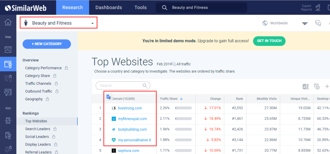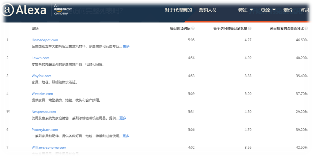 如下图所示,Similar web和Alexa是专门做网站排名的一类网站,他们会根据流量,访客等指标来给不同的网站做排序,类似国内的站长之家。基本上各行各业的网站排名以及具体的流量情况在这两个网站上面都能够找得到详细的数据,Similar web和Alexa可以帮我们快速锁定这个类目下面头部和做的比较好的网站。所以当我们确定一个大类目以后,就可以从这两个网站入手去深挖大类目下面的垂直细分领域,看看基于我们选定的某个类目或者某个目标国家下面相应网站的一个排序情况,可以把排名前列的网站找出来看看有没有可以在选品和运营上面可以学习和借鉴的点。