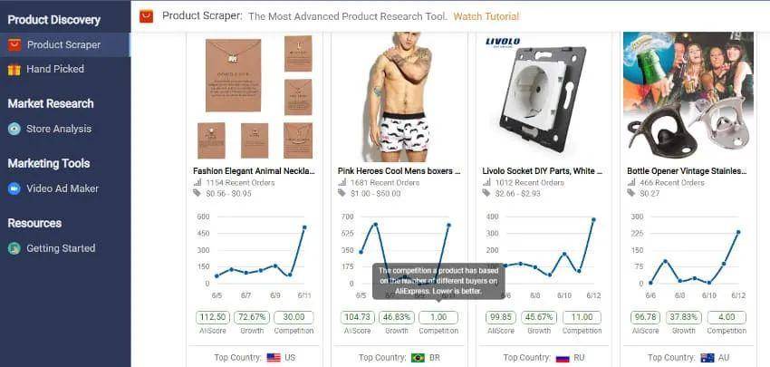 对于亚马逊卖家来说,Niche Scraper是一个相对陌生的工具。下面我来给大家好好介绍一下,它其实是一个用于独立站爆款选品的工具,会提供速卖通和Shopify商店目前最畅销的产品数据和信息。基于目前速卖通和shopify独立站上面所有的产品,我们可以按产品增长率、订单数或者综合指数来进行排序,也可以筛选类目、国家、订单数量区间等数据来定位出来符合条件的产品。