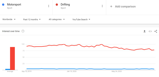 注:YouTube网民对体育运动中“漂移”的检索兴趣是“摩托”的18倍(来源:SEJ)
