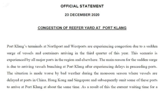 巴生港务局总经理Captain K. Subramaniam在一份声明中称,交通拥堵正在影响该港口的北港Northport和西港Westports两个港口,并补充道该地区其他主要港口也有类似拥堵情况。