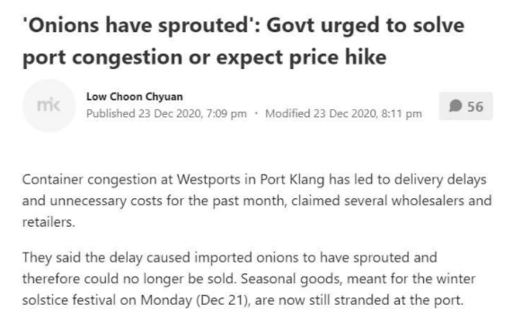 由于拥堵加剧,多家批发商和零售商称,巴生港西港的集装箱拥堵导致,交货延误超过一个月,增加了不必要的成本。因延误导致进口的洋葱已经开始发芽,无法进行出售。