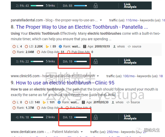 像截图里面,搜索how to use electric toothbrush,第一页里面竟然有2个网站DA小于20。那么我肯定,用我这套方法,有至少80%的机会能超过他们。