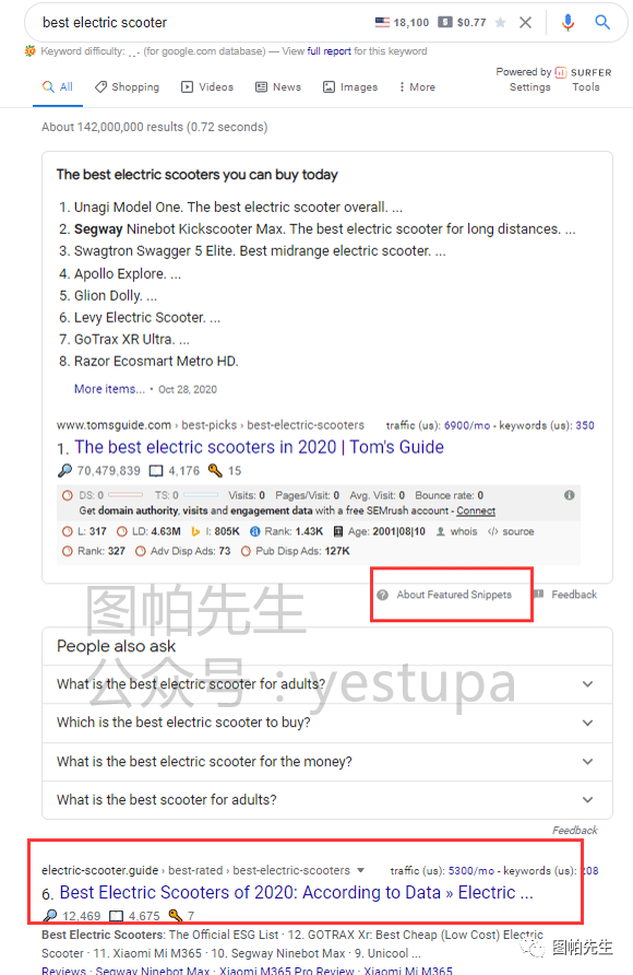 所以你仔细看下上上面一个截图,特色摘要调取的网站叫tomsguide,但自然搜索结果第一位却是electric-scooter.guide。(图帕先生原创:公众号:yestupa)