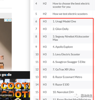 像随便搜一个词,best electric scooter,在第0位,也就是特色摘要(也叫精选摘要)的地方,显示了一列排名,而但你进入到文章,看他的结构,可以很清晰发现,他加了h3标签,作为一个内容层级的划分。
