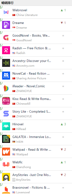 今年广告素材投放量超过 5000 的图书类 App 中除了上海若谷旗下的 Noveltoon 和 Mangatoon 以外,Readict、Webnovel、iReader、Bravonovel 的主要投放市场都在美国。其中 Webnovel、iReader、Bravonovel 都排在美国 Google Play 图书类畅销榜的 Top15,同时也可以看到,美国的 Google Play 图书类畅销榜 Top15 中,中国出海厂商占到了 9 个。(挂着美国国旗的 Bravonovel 的背后厂商也是一个中国厂商)