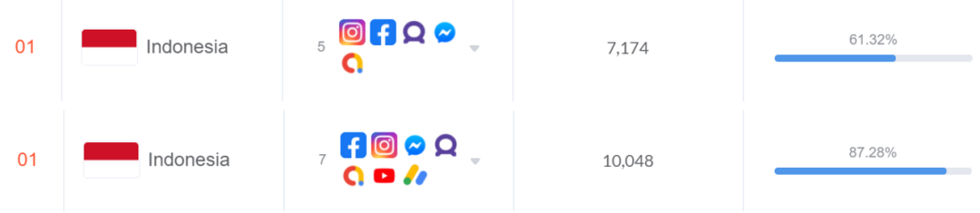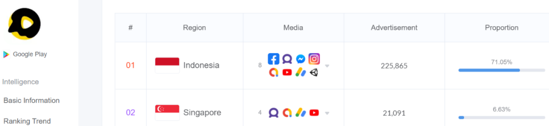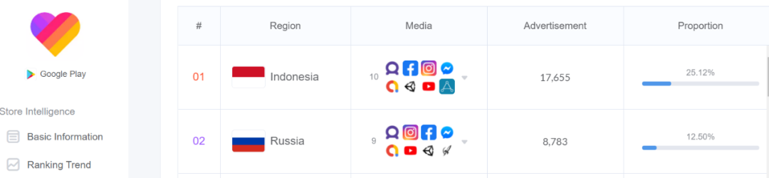 比如近一年来 Likee 在印尼的广告素材投放量比第二名的俄罗斯高出两倍以上。