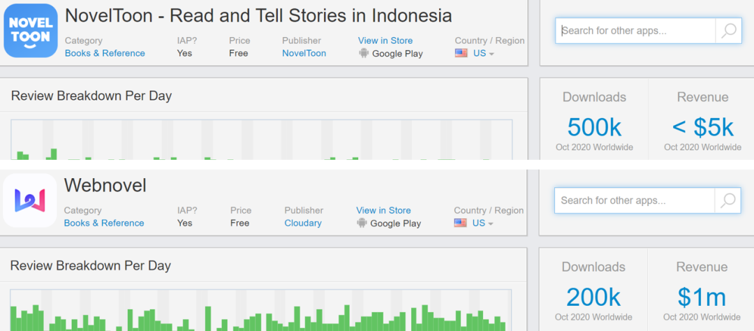两款 App 都主要做 Android 端的投放。根据 Sensor Tower 的数据显示,Noveltoon 的印尼版 App 在 10 月单月下载量达到 50 万次,但是收入不足 5000 美金。形成鲜明对比的是,Webnovel 10 月份全球范围内的下载量是 20 万,还没有 Noveltoon 在印尼一个市场的下载量高,但是单月收入却已经达到 100 万美金。