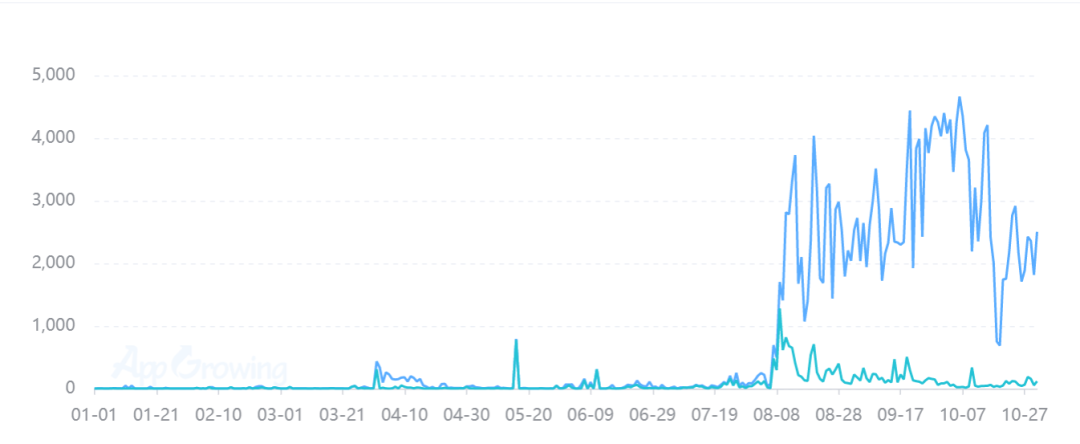 以 Uplive 为例,今年广告素材投放量达到 2.1 万,排名第 10 位。App Growing Global 的数据显示,Uplive 是从今年 8 月份开始大量投放的,其中 9 月中旬到 10 月初是投放力度最大的时间段。