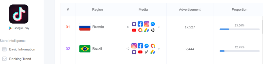 近一年来 TikTok 把重心放到了俄罗斯市场,在俄罗斯的广告素材投放量也几乎达到第二名巴西的两倍。