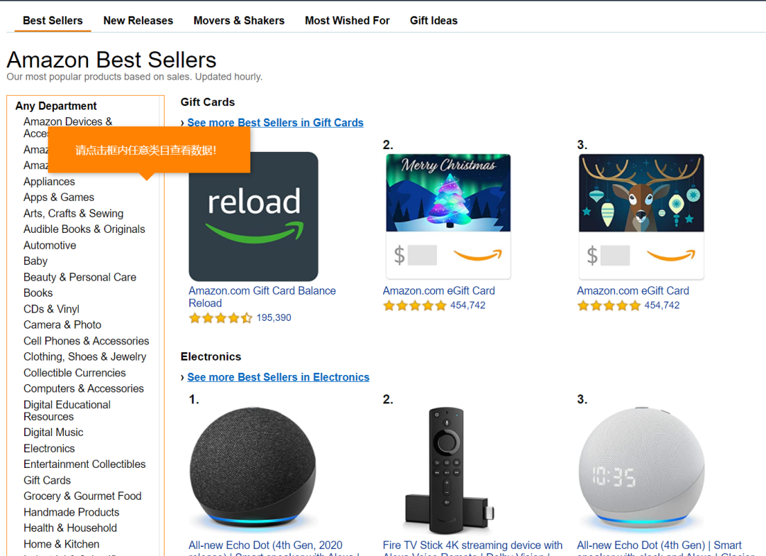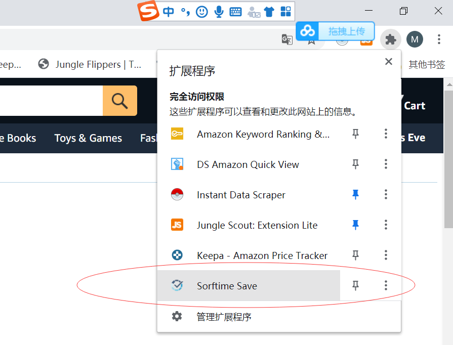 这个选品工具是一款浏览器插件,在谷歌和火狐的商店里面搜索“Sorftime Save”,找到这个插件以后就可以直接下载下来,下载完成以后在浏览器右上角点击插件图标即可进入到亚马逊前台的类目界面(即前台Amazon best sellers页面),如下图1和图2所示: