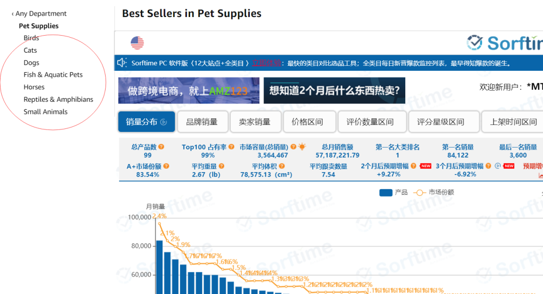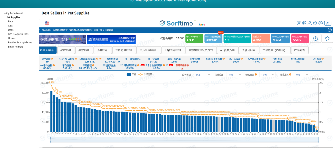 如图2左侧类目选择栏目所示,接下来我们可以随时选择任意的一级大类目来查看相应的数据。这里我点击了一级大类目“宠物用品”,即可得出在这个类目下面排名前一百名产品的销量分布情况,如图3所示。