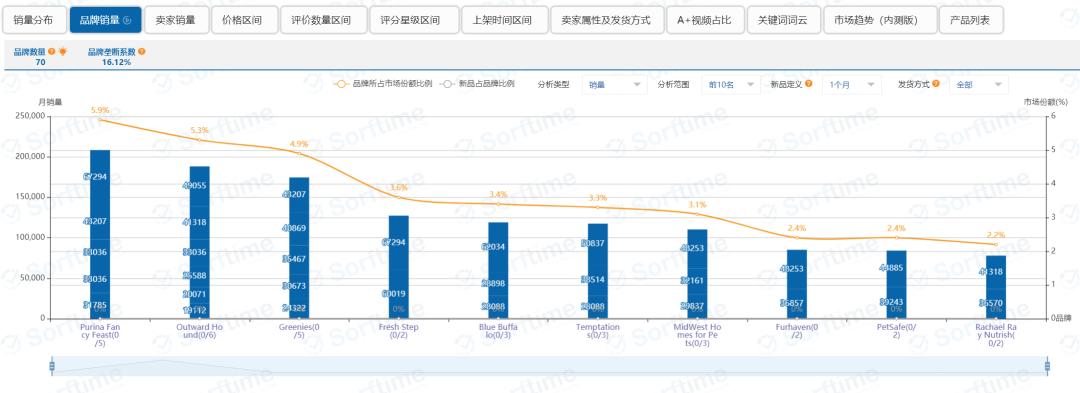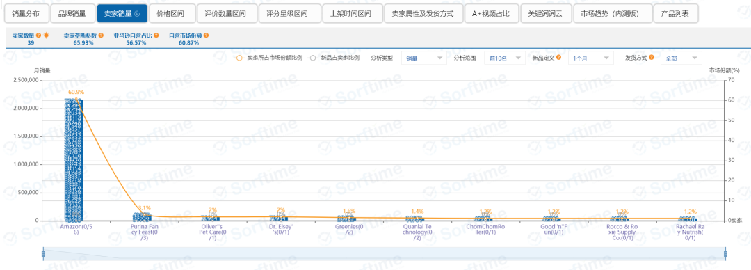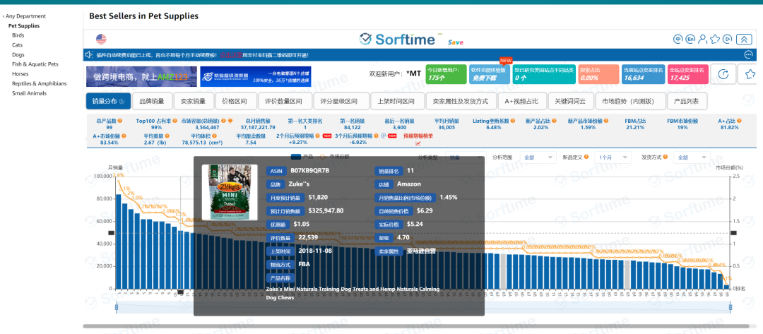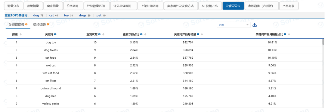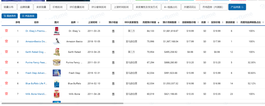 我们接着往下看,算上前面提到的销量分布情况以外,针对Pet Supplies这个一级大类目项下排名前一百的产品,一共可以查看12项不同维度的关键数据指标,如图5所示。