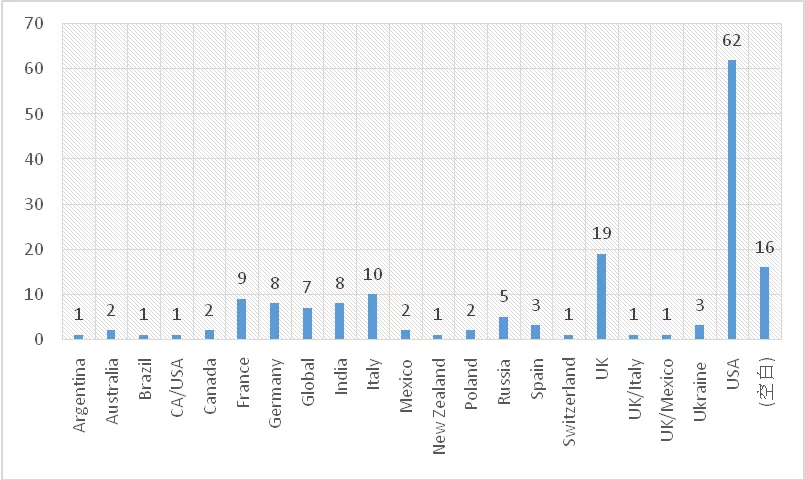 在此次搜集到的165个媒体/记者账号中,除了16个无法判断之外,剩余的149个账号来自21个国家和地区(包括双重或多重身份)。其中美国最多,有62个;其次是英国,有19个;欧盟国家的账号分布较为均衡,意大利10个,法国9个,德国8个;此外,印度也有8个,表现抢眼。