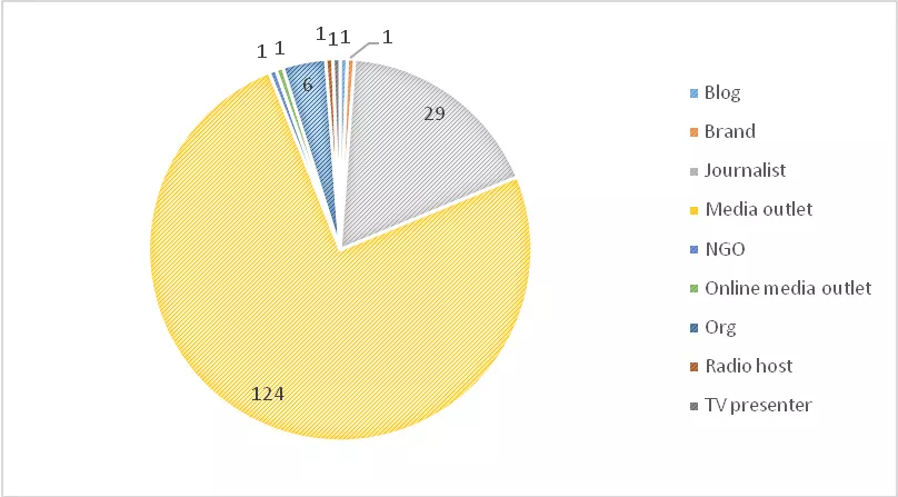 在165个账号中,除个别非常明确地突出自身的机构属性(如非营利性组织NGO,品牌推广,博客机构,在线出版等)之外,能够清晰界定出是媒体出版商的账号有124个,占比达到75.15%,相当于有四分之三的账号都是媒体机构账号;剩下最多的是记者个人的账号,有29个,占比达到17.58%。
