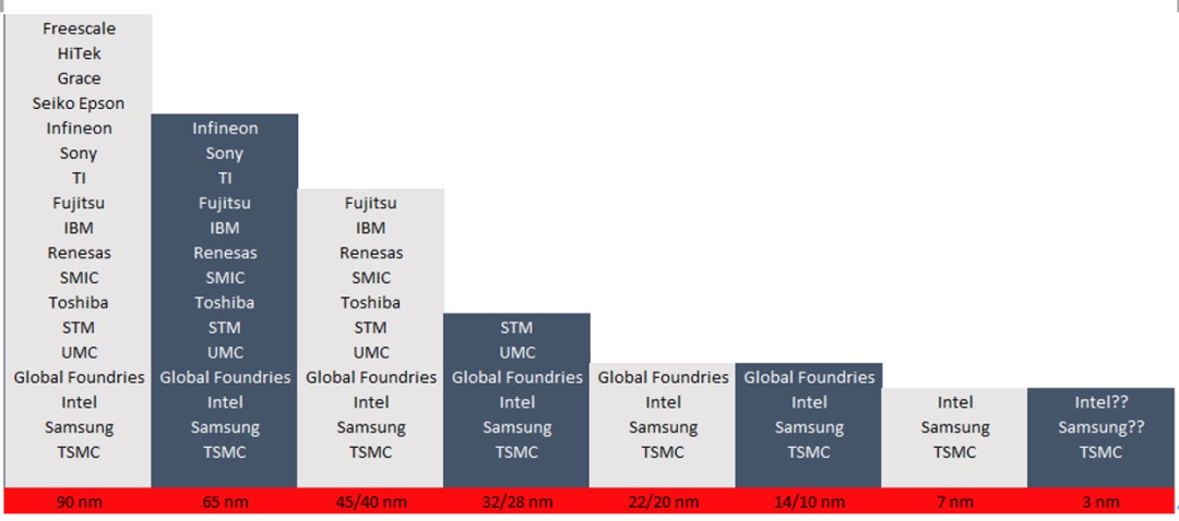 全球主要芯片制造厂商制程进展,英特尔落后台积电和三星