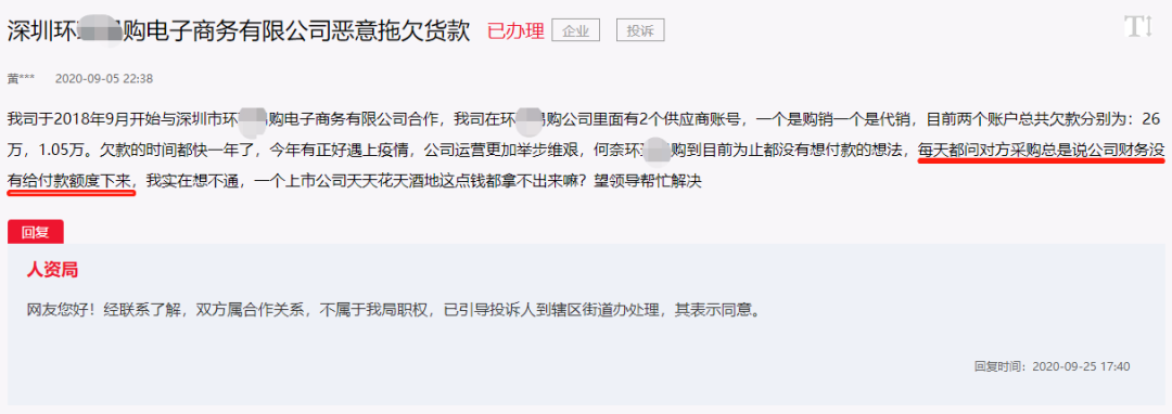 一位家居供应商向该记者透露,自2016年起与深圳环XX购有业务往来,至今环XX购欠他们200多万元的货款。最早一笔欠款可追溯至2019年9月30日,当时深圳环XX购承诺的最迟付款日期是2019年9月30日,一年多以来,他多次向环XX购索要欠款都无果。