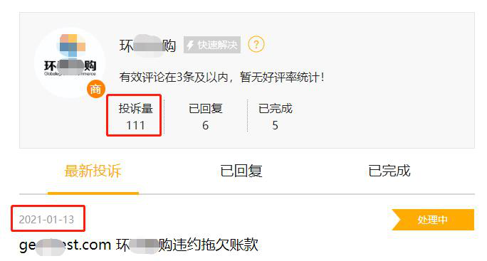 在新浪旗下的黑猫投诉平台上,侃哥发现关于环XX购的投诉多达111条,涉诉金额总计超过1200万元。最近的两条投诉就发在2021年1月,这100多条投诉反映的问题基本都是拖欠货款。